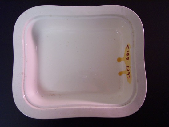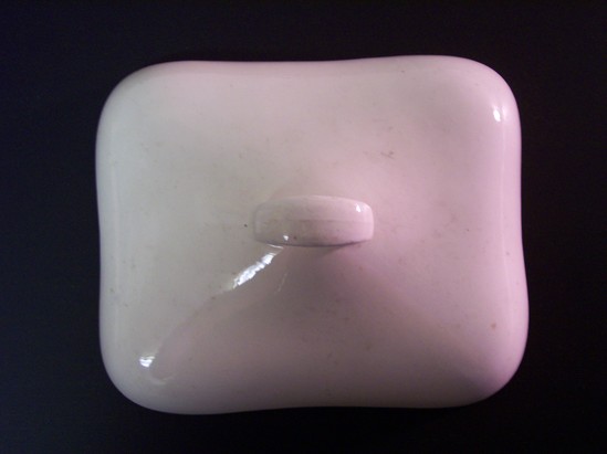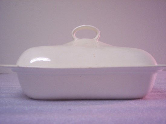 Covered vegetable dish. Lobate, oblong with lid. Lid has a handle in an oval strap. Both are plain, white porcelain. Stamped on the bottom "Davenport" with an impressed anchor.