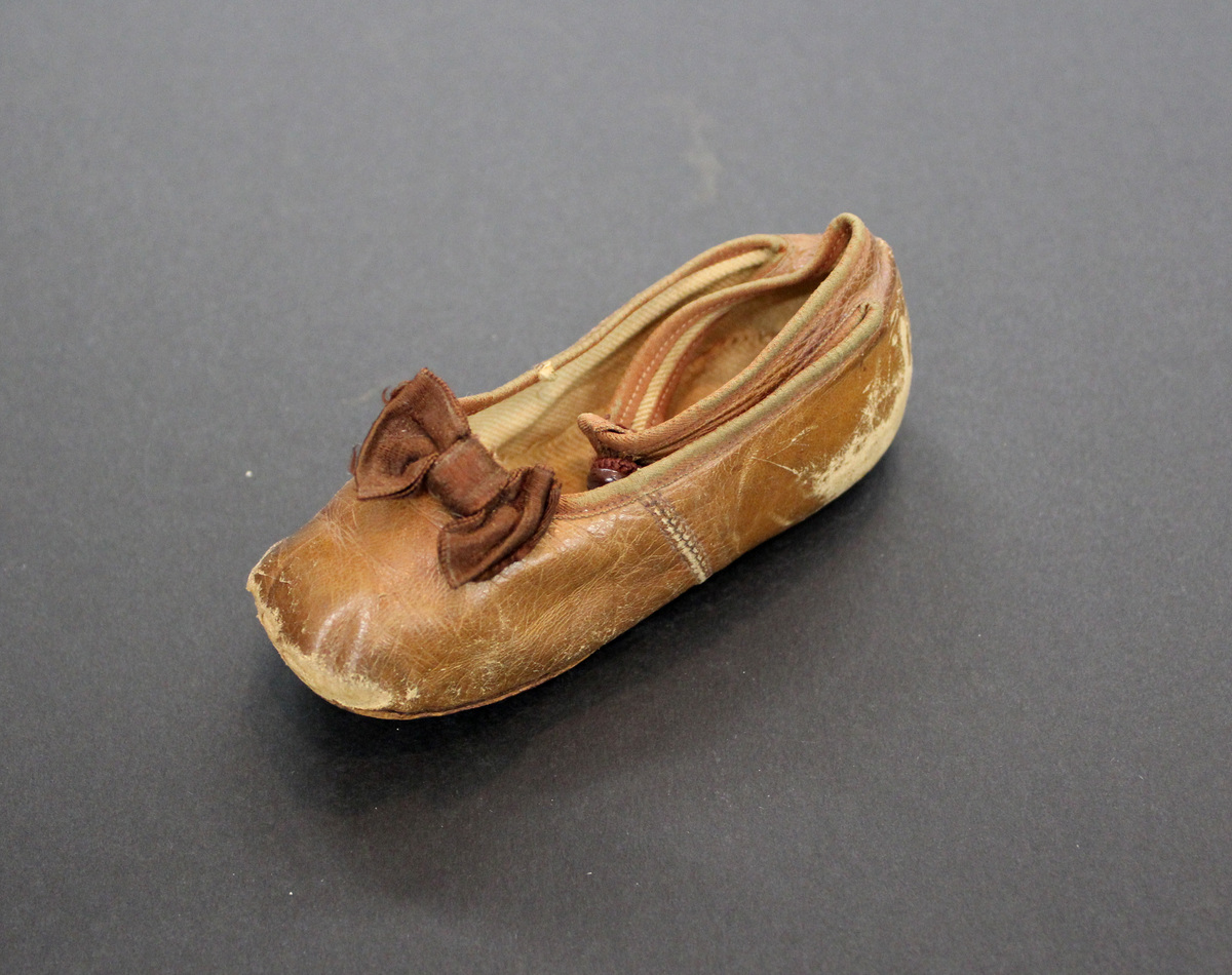 Brown leather child's shoe; ankle strap with one button hole and brown button; brown silk bow on top; square opening; tan cotton twill lining; tan leather bottom; handwritten inside: "550".