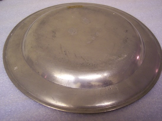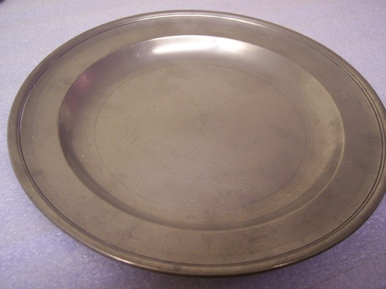 Pewter plate, double reeded rim, reed in bottom, three marks on back - "F.BASSETT NEW YORK" in scroll around crown and rose, found hallmarks - lion, ship, scales, "FB"