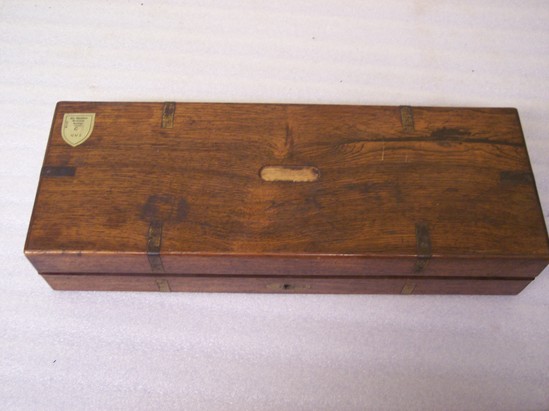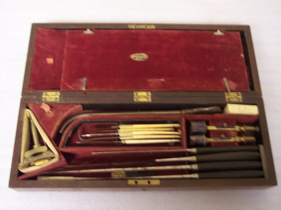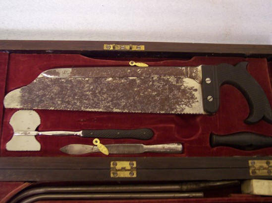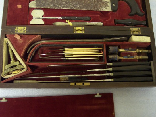 Wooden case inlaid with brass. Brass hinges. Red velvet lining fitted to hold specific instruments. Various surgical instruments, knives, saws, pliers, a brush, needles, a box of quinine capsules, etc. Used by Dr. Wm. Deming of Litchfield who graduated from the medical department of Yale College in 1856