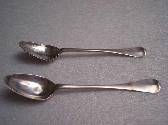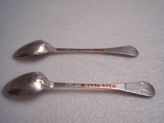 2 silver coffee spoons. "RF" in rectangle on reverse of handle. Block letters of "F" "I" "B" arranged in triangular pattern on reverse of spoon. Bowls of both spoons bent, dented and scratched