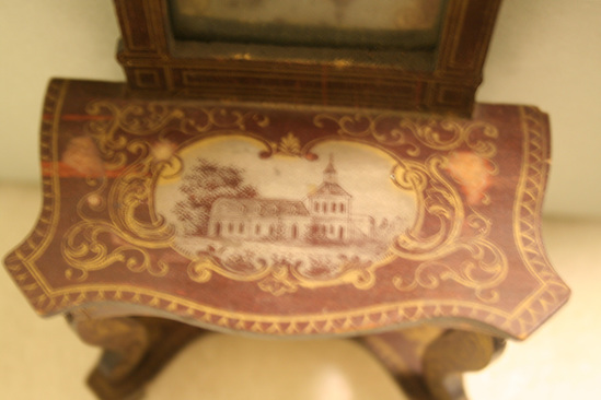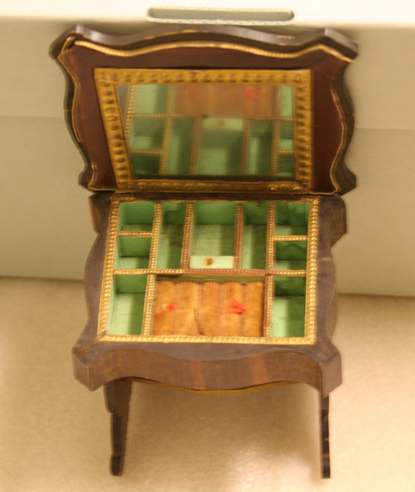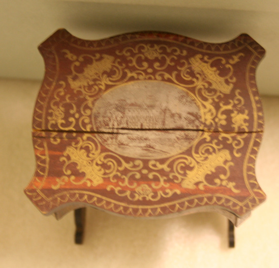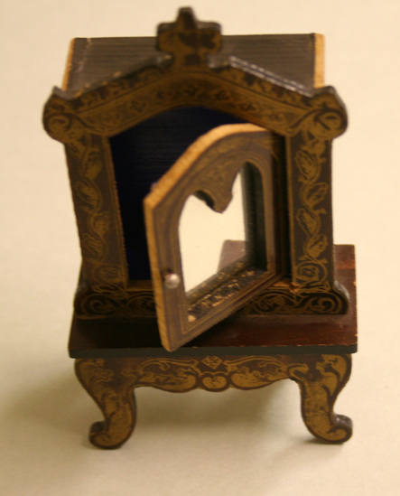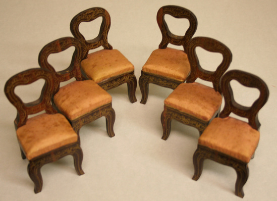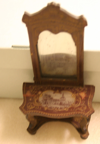 A - Dressing Table - 3 1/2" long x 2 1/2" deep s 3" high - flip top table, paneled gilt veneer wood with paper and mirror, lined compartments, oval painted scene on top of table B - Cabinet on stand - 2 3/4" wide x 1 3/8" deep x 4 3/4" high - sabre leg base with hutch top mirrored door; gothic designs in gilt C - Pier table with tall mirror - 3 1/2" wide x 1 3/4" deep x 8 3/4" high - cabriole legs, ball feet, tall arched mirror on top, chateau painted in cartouche on table top D-I - 6 chairs - 3 2/3" high x 2" wide x 2" deep - pink silk seats, same decoration