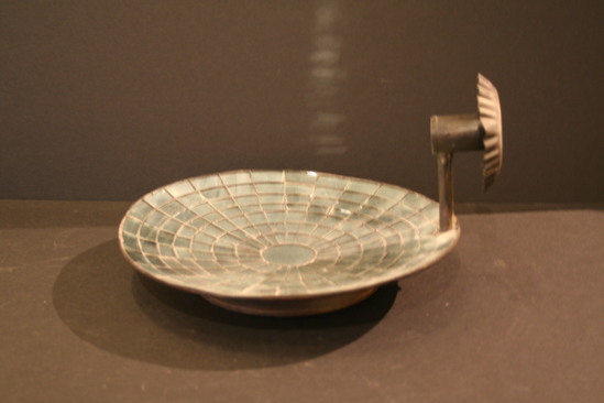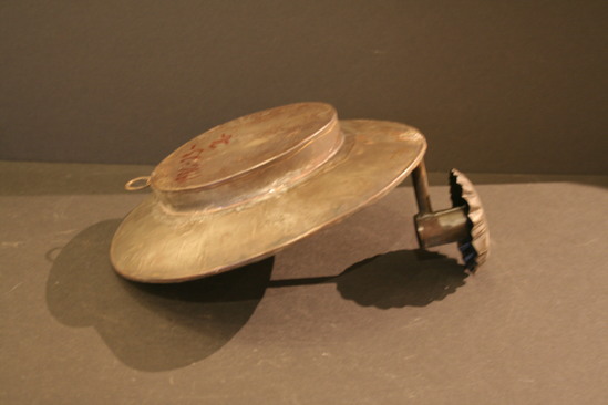 2 mirrored sconces. Concave backing covered with cut mirrored glass piece in seven rows, tapered to round center, backed with tin plated iron, large round can back with ring top and bowl shaped edge, from bottom comes round shaft to cylinder candle holder with fluted base bobeche.