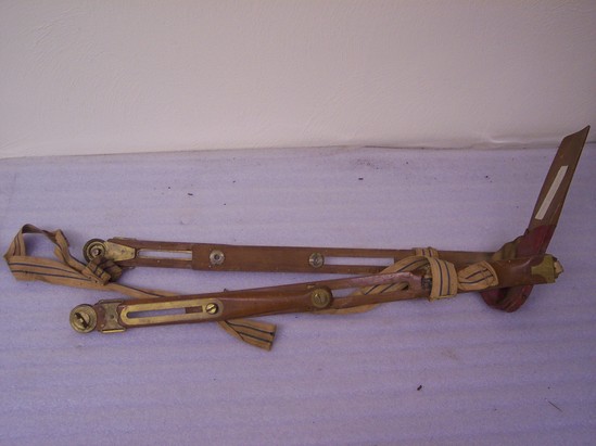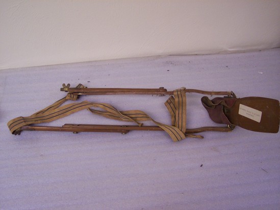 Foot and leg splint - flat wooden foot piece with red leather heel cup. Two wooden pieces extend from foot piece up each side of leg. Brass buckles, screws and knobs along each side brace. Red, white and blue striped canvas strap woven through buckles in two places. Each side brace could be extended or shortened depending on person's height