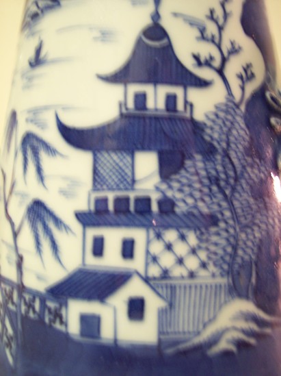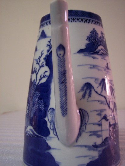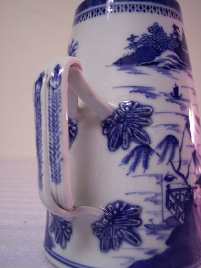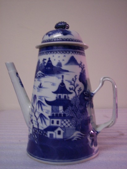 Tall, pyramid shaped coffeepot (A) with two-strand woven handle with foliate terminals. Long, straight spout. Asian scene of two houses, trees, and birds. Lid (B) has a raspberry knop.