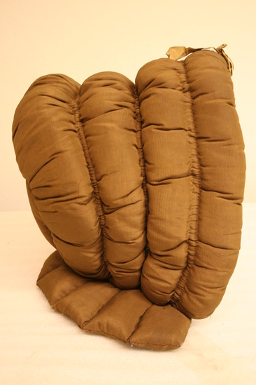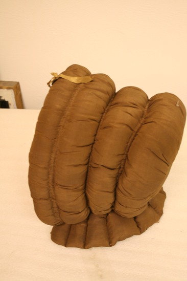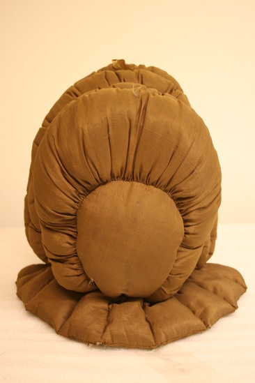 Brown silk bonnet stuffed with down feathers; quilted with four wide bands; small brown silk bow at center front brim; brown silk interior