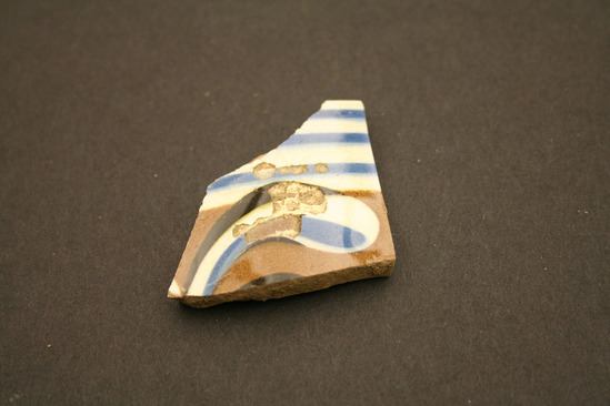 Piece of ceramic; one side has brown, blue, and white abstract design