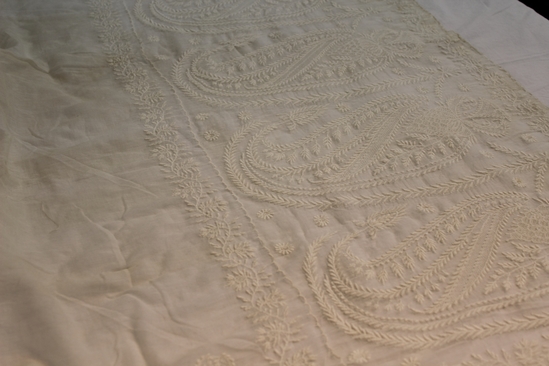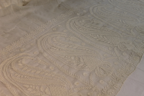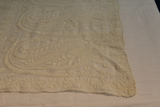 White mull shawl; embroidered floral design down sides; at each end is intricately embroidered panel; 17" high, large paisley like design with branches and flowers; edges of shawl slightly scalloped
