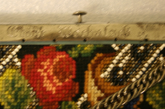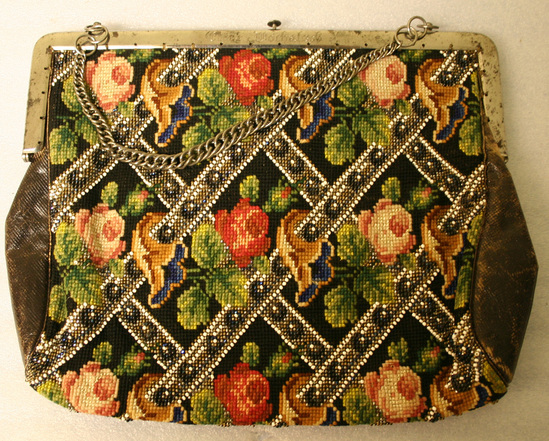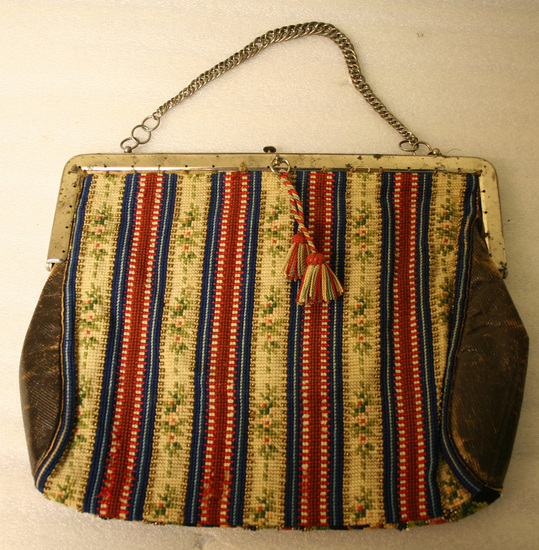 Purse or small bag. Metal frame at top, plain except on one side "Emily Wochatsch" engraved on frame. Push button clasp on top. Heavy chain link handle attached to frame. One side of body made of wool needlepoint in floral design with criss-cross lines of beading. Other side also made of wool needlepoint in striped design with gold bead accenting. Two sides of brown leather. Interior lined with leather