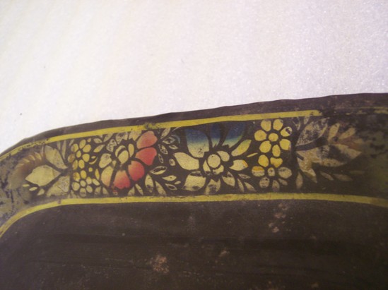 Oblong tray with rounded corners and curved edge. Center has two bands of a silver color that has tarnished. At bend is a gold line, then a band of stenciled flowers and leaves in many colors - red, blue, yellow, silver with a gold band on the outer edge. Rim not rolled, just cut tin