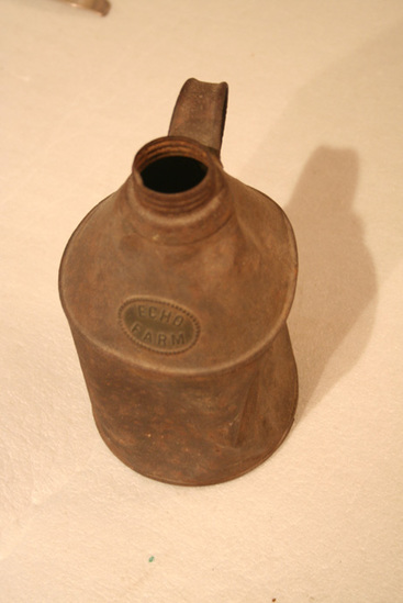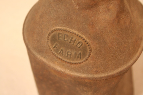 Round iron milk can. Narrows towards top with small opening with grooves for screw on cap (which is missing). Short round handle on one side. Raised label near top "Echo/Farm" with beaded border in oval shape