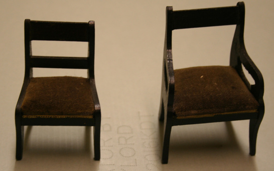 A - Jig saw cut Sheraton type arm chair with plush purple seat. 3" high x 2 1/8" wide x 1 3/4" deep B - Jig saw cut Sheraton type side chair with plush purple seat. 2 3/4" high x 1 3/4" wide x 1 1/2" deep