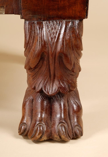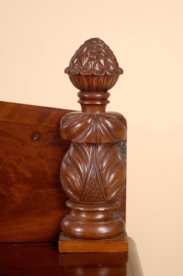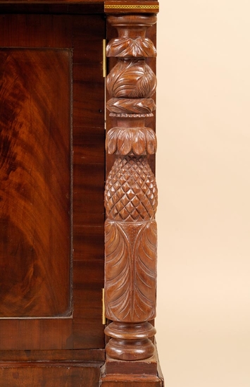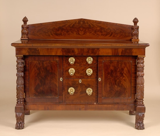 Empire style sideboard. Mahogany veneer. Flat top with attached backboard. Backboard meets at peak in center. Column on each side of board of vase shaped acanthus leaves with grooved finial on top. Column down each side of front of piece ending in large hairy paw foot. Two cabinet doors hinged on outer edges with brass key hole plate. Two shelves in each cabinet. Three drawers in center of sideboard. Progressively taller from top to bottom. Bottom drawer deep enough to hold bottles. Bottom drawer has brass key hole cover. Each drawer has two large brass drawer pulls - round, pressed floral design with circular shaped drop pull.
