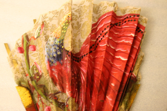 Fan with wooden sticks painted gold. Translucent gold/amber colored plastic attached to both exterior sides of fan. Body of fan made of transparent white gauze with gold floral design woven into fabric. Body semi-circular and over sized being higher in center than at sides. Painted on silk is bird with red/pink wing spread out along body of fan. Bird accented with black and gold sequins.
