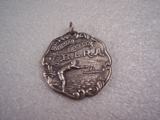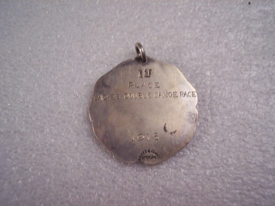 Sterling silver medal with loop at top, rococo curved edges with organic raised edges. At top in ribbons "Annual/Regatta/B.L.R.A." (for Bantam Lake Regatta Association). Figure of swimmer poised for diving at left with canoe in middle background surrounded by lake scene. On flat back "1st/Place/Ladies Double Canoe Race/1915" Awarded to Sally Bissell (Mrs. Frederick Coe)