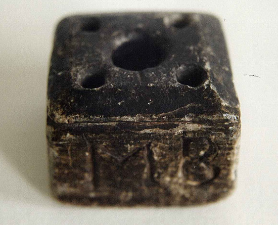 Carved soapstone inkwell, probably from East Litchfield soapstone reserves. Square shape, top with large central hole for ink, and four smaller holes at each corner to hold quills. Made by George Buell (1804), of Litchfield, son of Abagail (Bush) and Jonathan Buell. Made for his sisters, carved with their initials on each side: "M B" (Maria or Marian) "RB AB" (twins: Abbe and Racheal) and "H H" (unknown) and "_ B" unknown