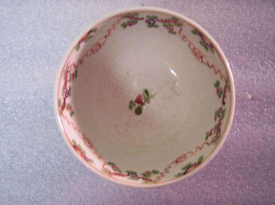 Tea bowl is decorated with garlands of flowers in polychrome and is overglazed. No handles. Has single, small flower at the base on the interior.