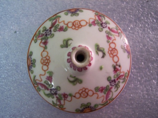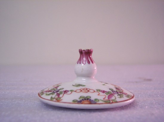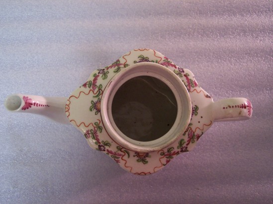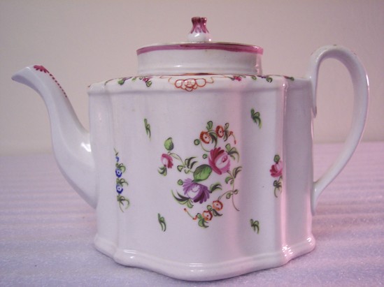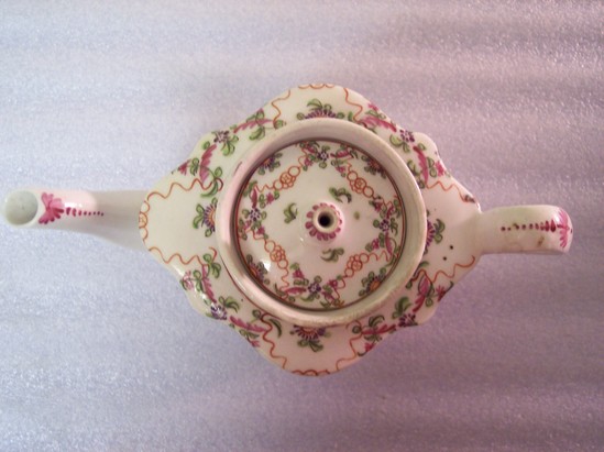 Teapot (A) is high and narrow with an ear handle, crenellated sides, step base, paneled spout, and round collar. Lid (B) is round with finial steam hole. Lid recesses in the base. Decorated with garlands of flowers in polychrome and overglaze.