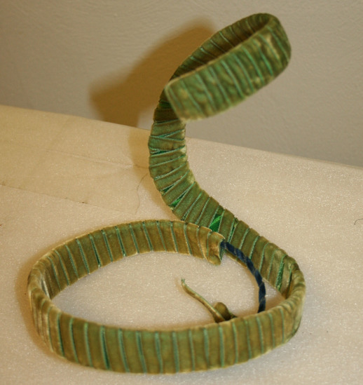 Hat or hair piece - 1" wide band lined with green silk ribbon and then wrapped with green velvet ribbon. The band is coiled to go around the head and then twists upward above head in a curled form. Metal wire that comes out of bottom of head piece - covered with blue velvet material with green velvet bow at end.