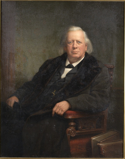Oil on canvas portrait of Henry Ward Beecher. Rectangular 3/4 length lifesize portrait of elderly man seated head facing front, body to the left. Two large volumes at feet in right coner of canvas. Black suit, white shirt, black tie, pocket watch chain visible, shoulder length gray hair. He is seated in a wooden chair with upholstered back and arms. Frame is wooden with plaster decoration painted gold.