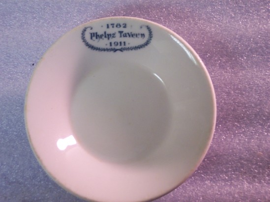 Small, white dish with green writing stating, "1782/Phelp's Tavern/1911" and framed in a green garland.
