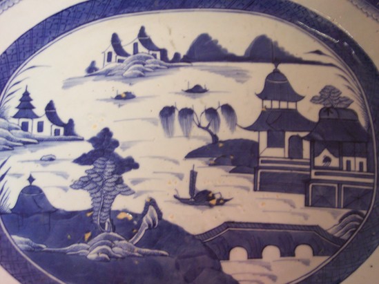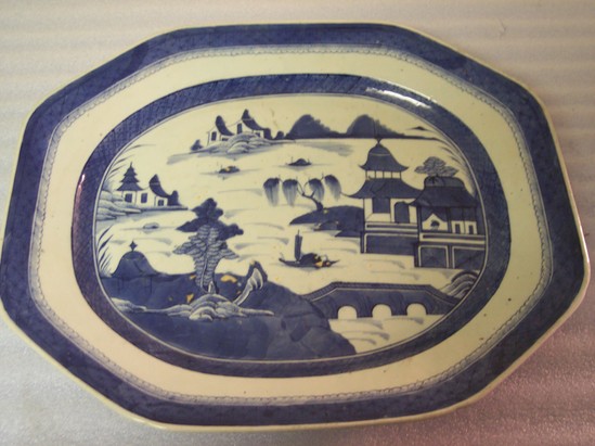 Oblong platter with chamfered sides. Very fine decoration of the classic blue and white "Canton" type. Unglazed base with cross hatch work. On underside of rim, platter is etched with the letter "G."
