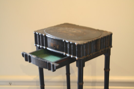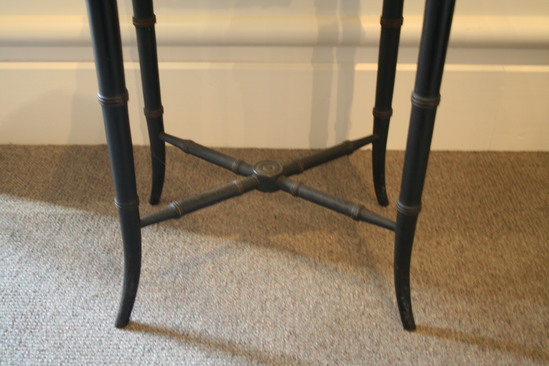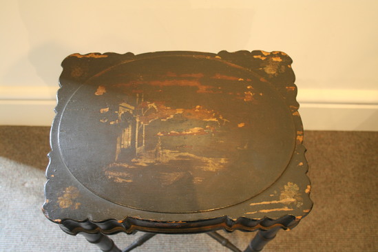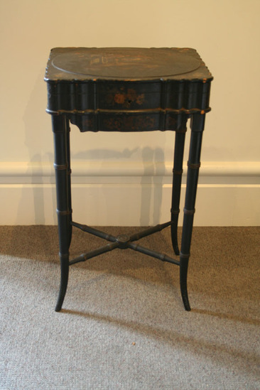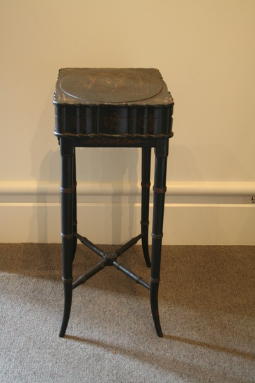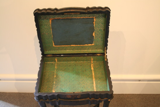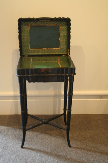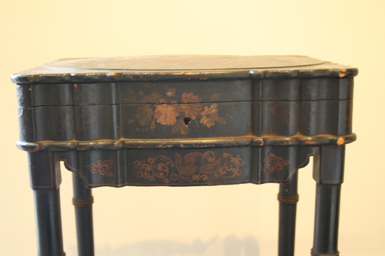 Small papier mache sewing table; Bamboo legs that flare outward with X shaped brace between legs 6" off of floor. Box on top with oblong skirts on sides and back. Drawer on front with shaped bottom and decorated front. Top of box has slightly raised oval dome with romantic scene portrayed. Sides of top have floral and geometric design. Hinged lid lined with green and gold paper.