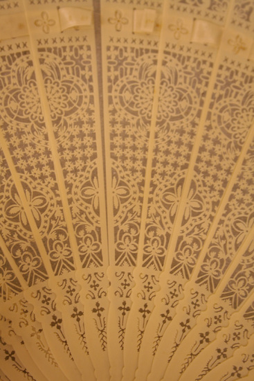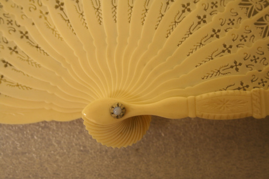Ivory fan with elaborately pierced design on each stretcher. White satin ribbon woven along top of each stretcher to hold them together. Opal and silver button at bottom of fan joining stretchers.