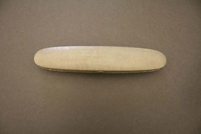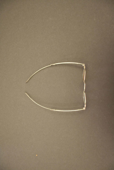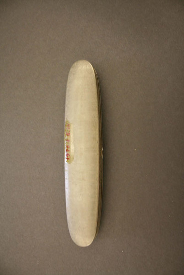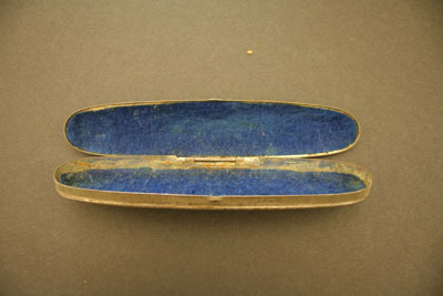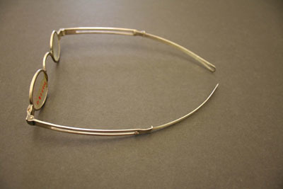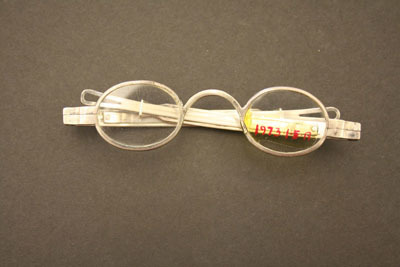 Eyeglasses have oval lenses, hinged bows with extension arms that slide out and in. Bow end in tear drop shaped loops. Case is oval, made of tin with blue velvet lining. Under front snap "Pat. Jan - 1860"