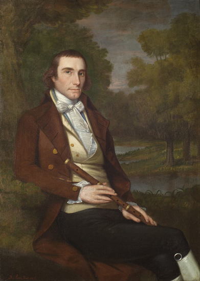 Oil on canvas portrait of Philo Ruggles (1765-1829) as a young man, seated in exterior setting with water and rolling valley in background. Dressed in brown jacket, yellow vest and black breeches. He is holding a flute in his right hand. Signed lower left, "R. earl Pinxt 1796" Retains its original frame.