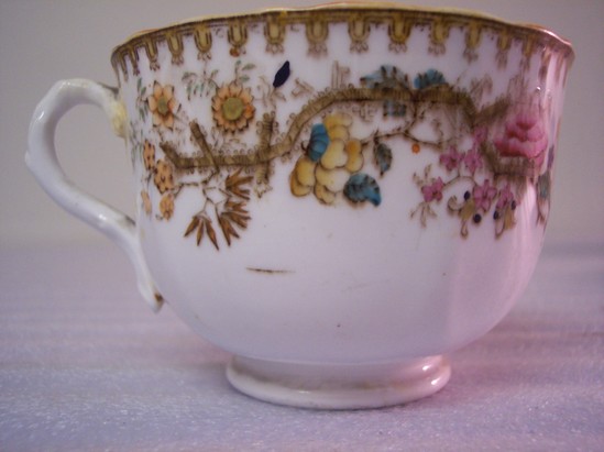 Deep cup with ring base, paneled rim, and deep center. Decorative scene has yellow geometric repeat pendant rim, multicolored rustic bouquets on rim and large rustic oriental type bouquets in centers. Marked "7324/111" on the bottom.