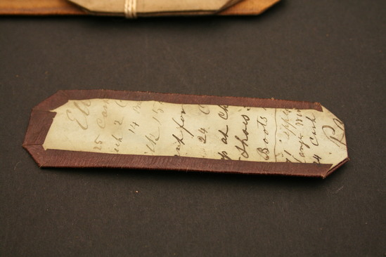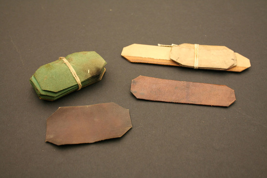 bundles of leather labels; either dark brownish red or green in color; octagonal shaped; elongated