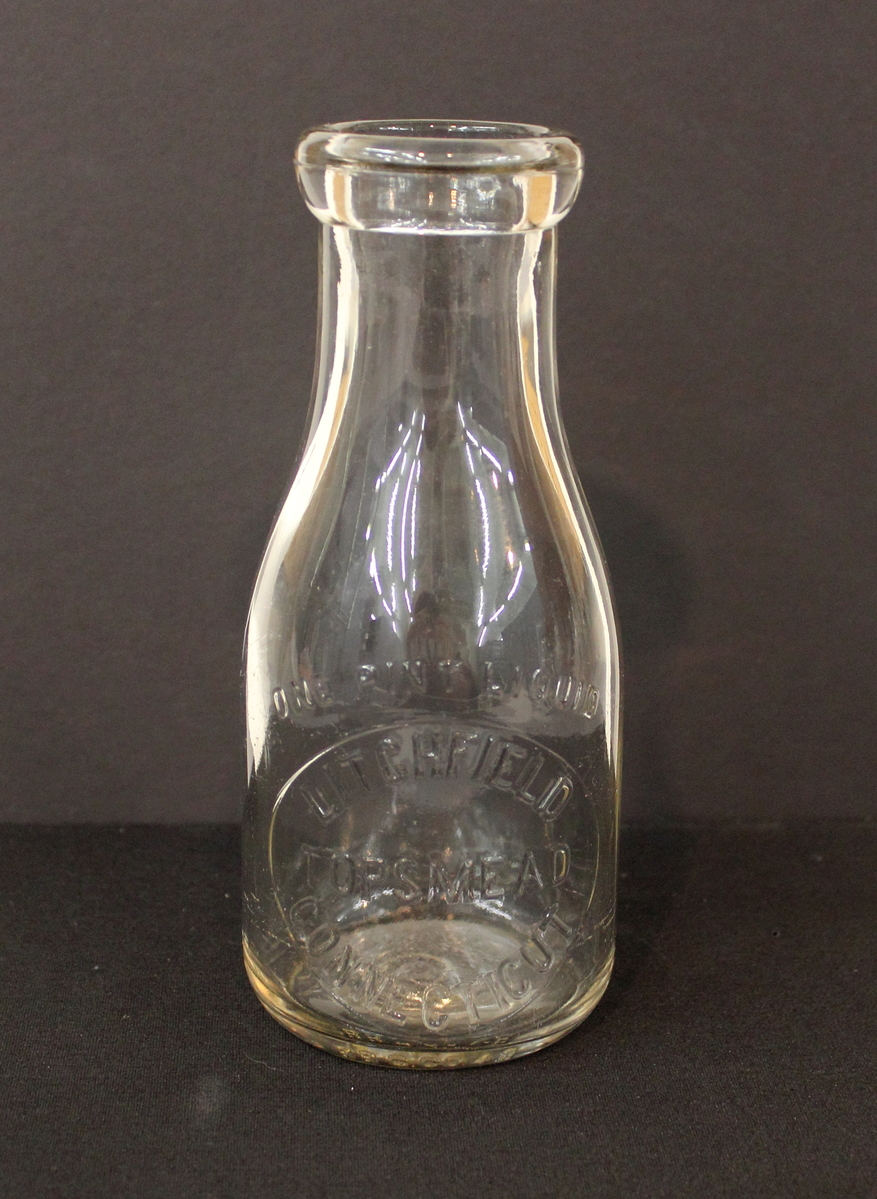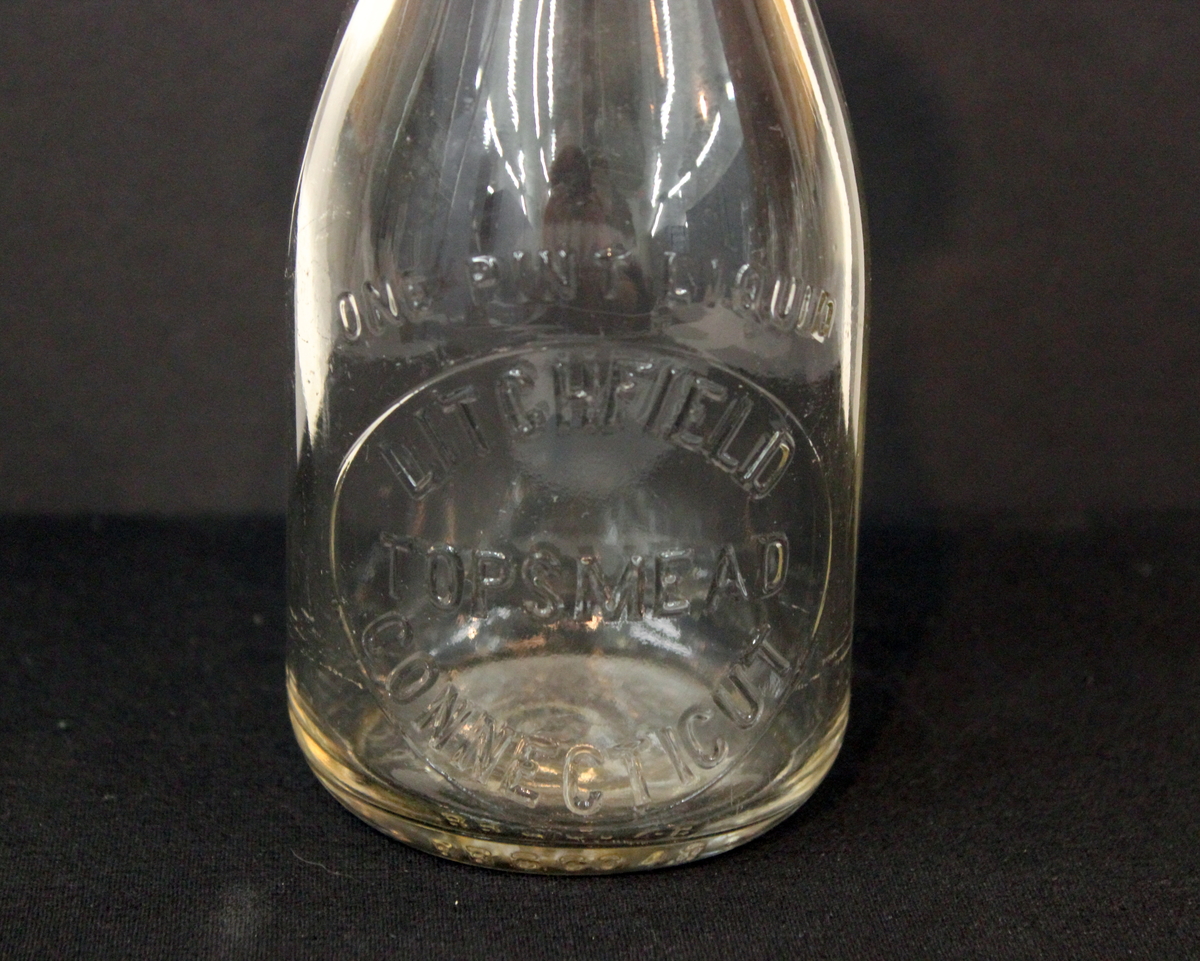 Glass milk bottle with round lip top, circular bottom, and tapered sides. One pint. Embossed lettering on front, "ONE PINT LABEL/TOPSMEAD/LITCHFIELD/CONNECTICUT." Circular shape embossed on bottom with "7" on the edge.