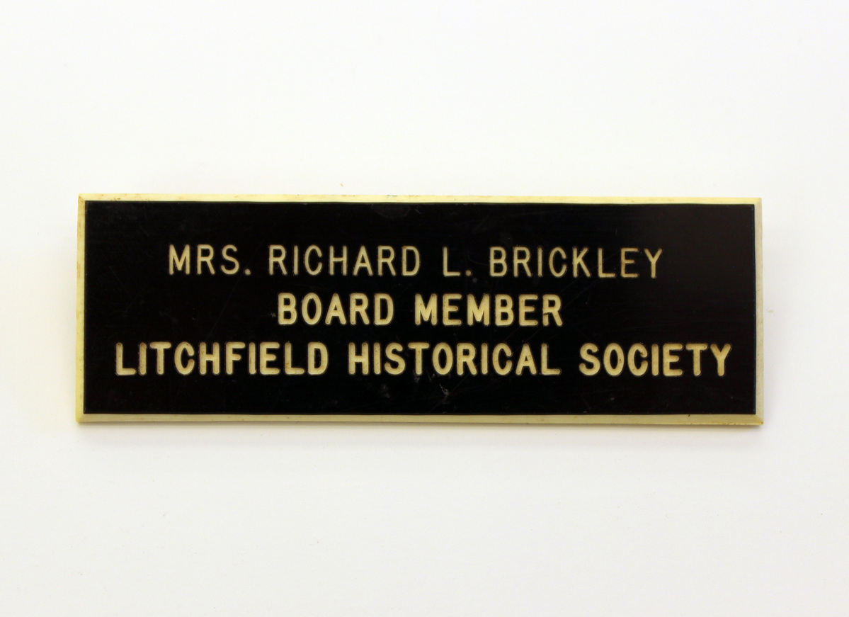 Rectangular plastic name tag. White plastic tag with black plastic front overlay. Hollow cut lettering on black overlay, "MRS. RICHARD L. BRICKLEY/BOARD MEMBER/LITCHFIELD HISTORICAL SOCIETY." Metal clasp with pin attached to reverse.