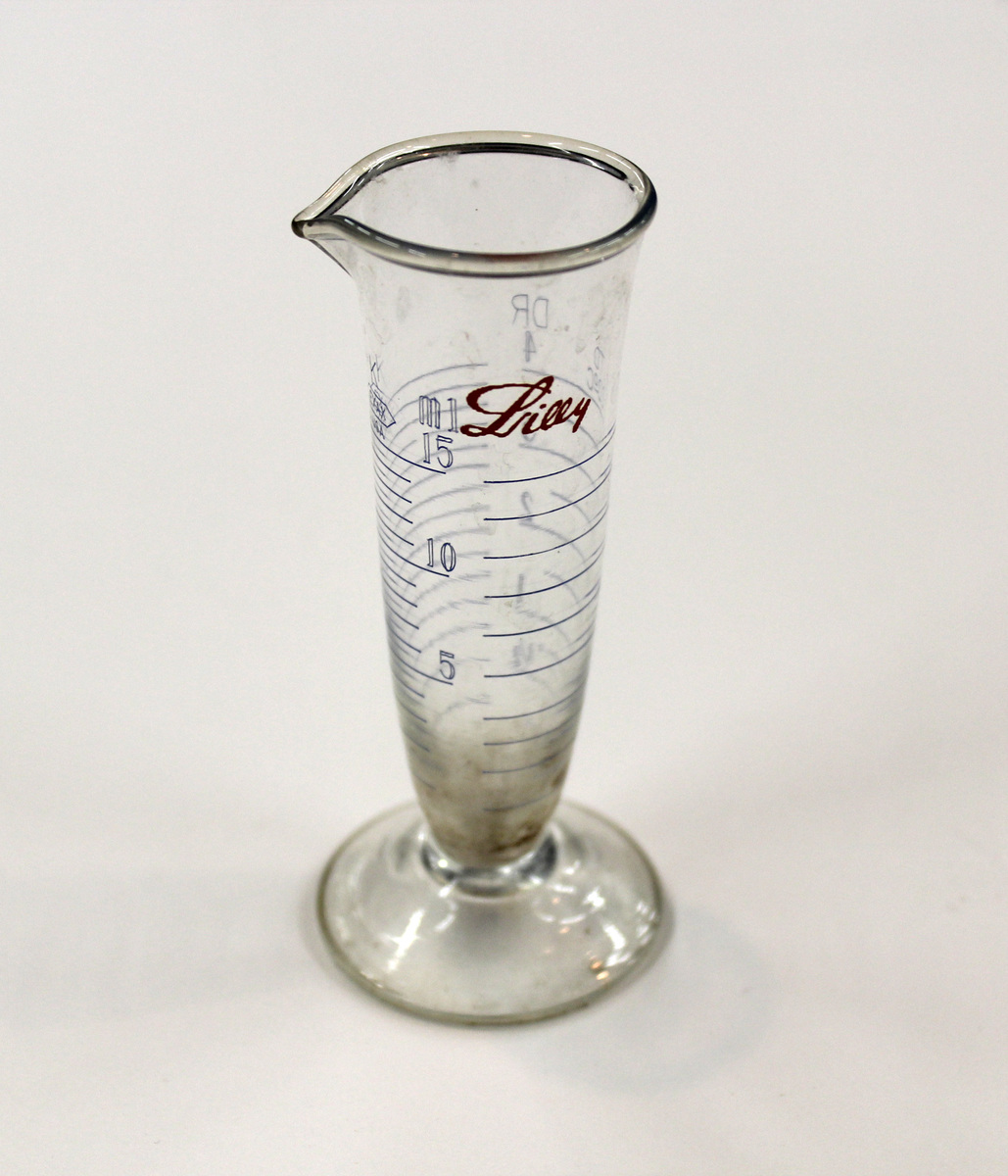 Glass conical measure for pharmaceutical use. Glass cylinder with flared rim and small spout, tapering slightly at bottom where it connects to a round glass base. Graduated measurements on one side, 0-15 ml; 04 dram on the other. Measurements in blue ink. Stamped in blue ink below rim, "K/EXAX/USA" and in red ink "Lilly" in script font.