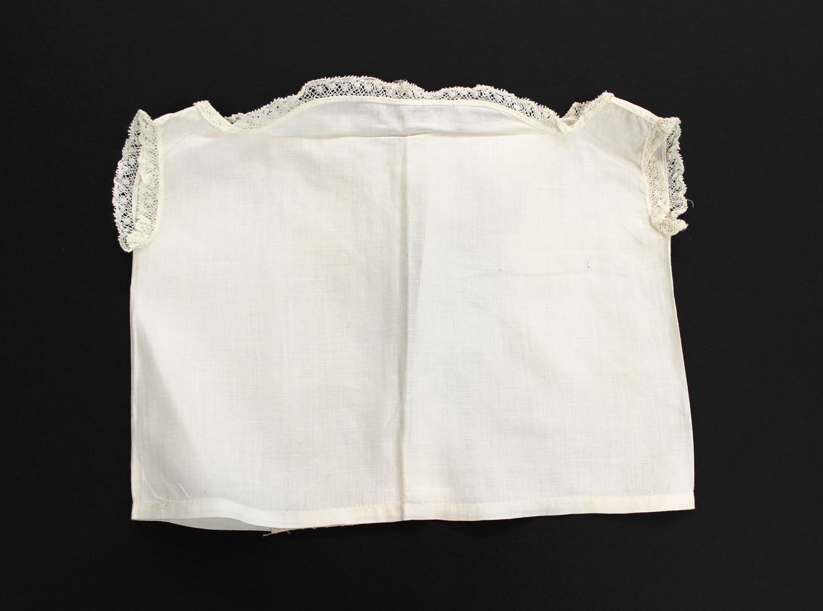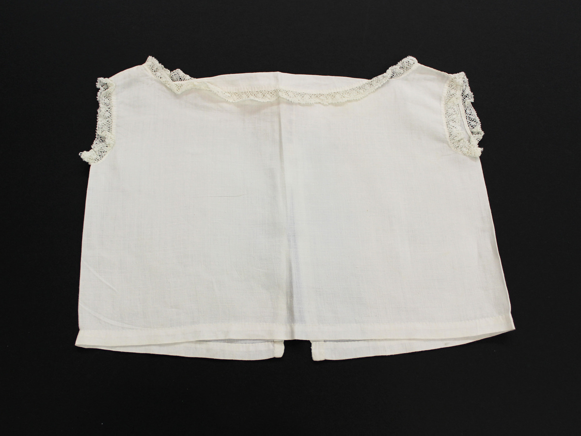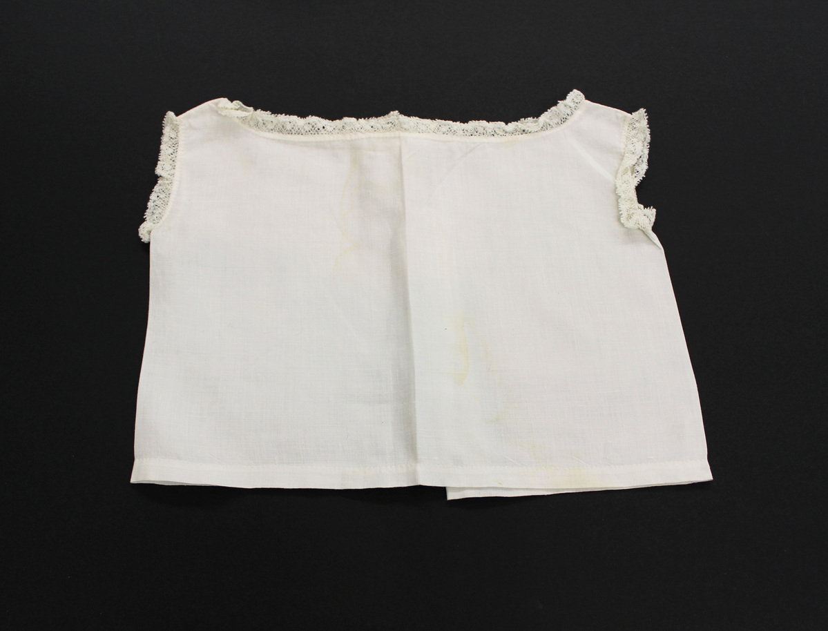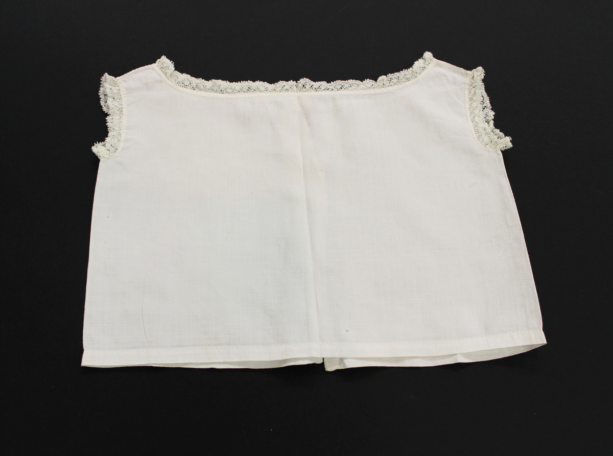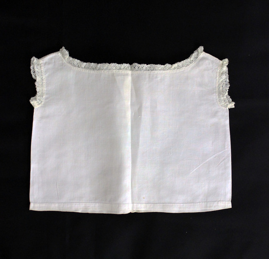 a-d: Four identical white cotton child's undershirts; lace edging at arm hole and neck; open down center back