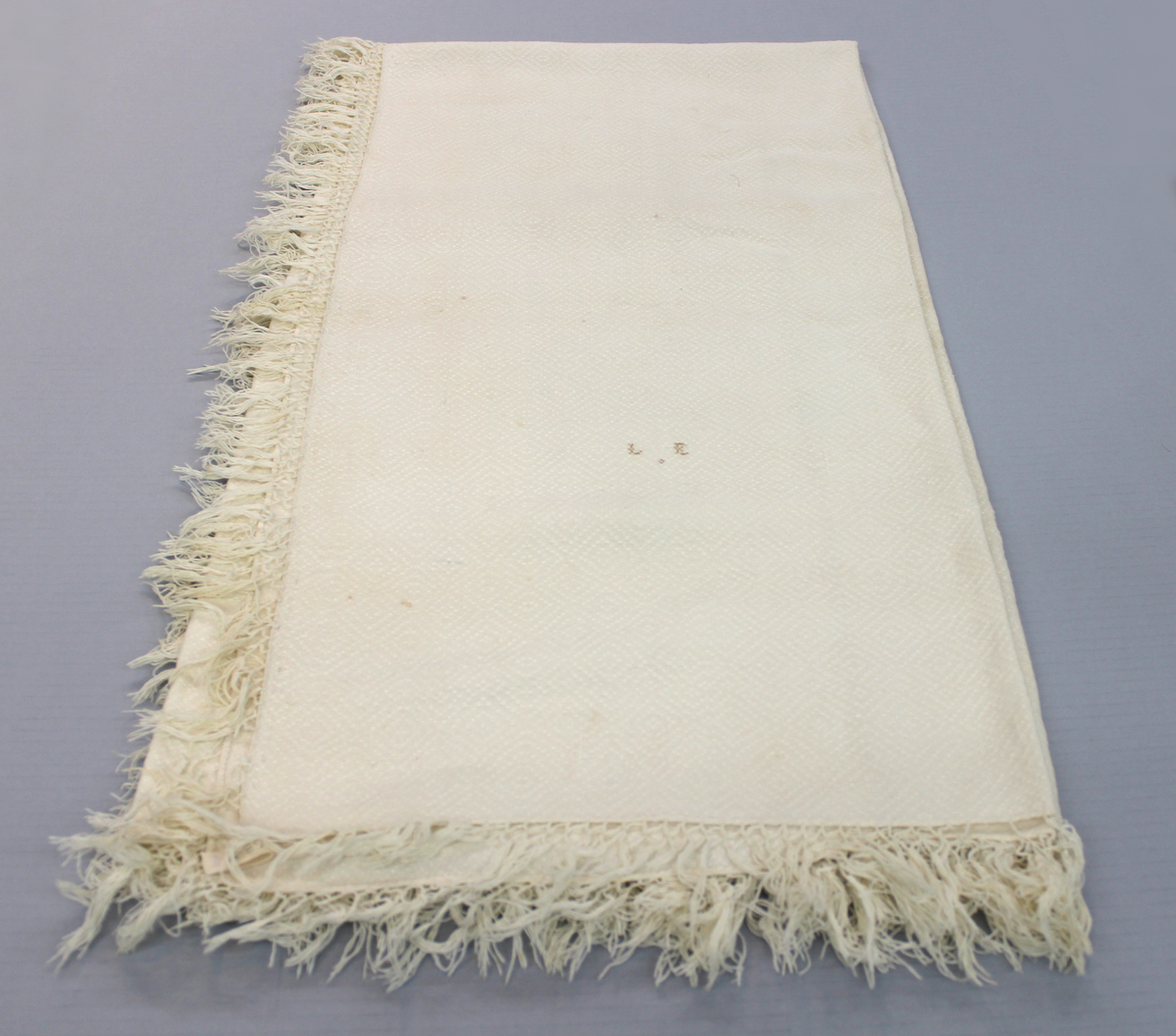 Hand-written note: "This tablecloth was given to A.E. Kenney by Lavina Ensign Woodruff, afterwards Westover, Mother of A.E. Woodruff Kenney Ensign, woven by Lavina Ensign about 1809."