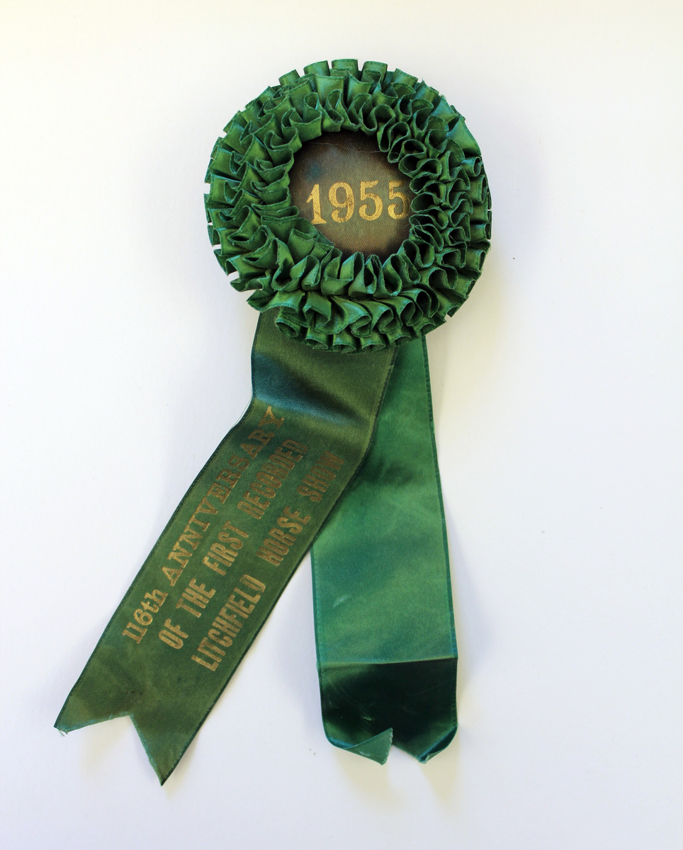 Green satin ribbon with rosette of green satin on top, circular button in center. Button stamped at center in gold lettering, "1955." Two satin tails extending below rosette; left tail stamped with gold lettering, "116th ANNIVERSARY/OF THE FIRST RECORDED/LITCHFIELD HORSE SHOW." Metal hook on reverse with blue and white paper label for Pegasus Sales Co., New York, NY.