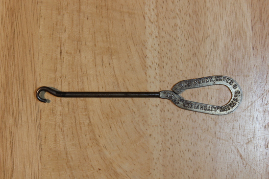 Metal advertising buttonhook. Hooks is affixed to a handle impressed with "L.R. DENEGAR, SHOES & CLOTHING, LITCHFIELD, CONN."