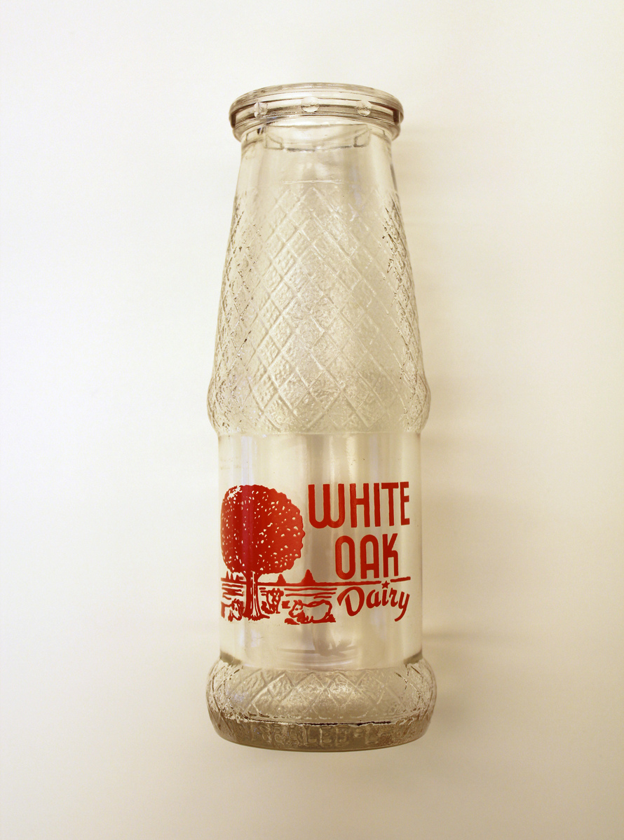 Glass milk bottle with round lip top, circular bottom, tapered sides, and inset band on bottom half. Pressed glass with incised crosshatch pattern; smooth glass on inset band. Printed in orange ink on band, "WHITE OAK DAIRY" next to image of a pasture with cows and a tree. Stamped on glass bottom, underlined "9."
