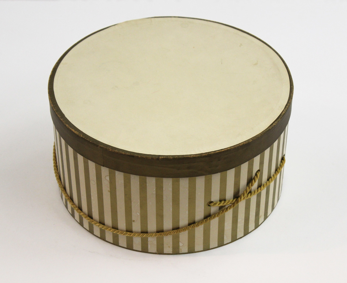 Round cardboard hat box; alternating gold and white striped paper around exterior. Solid white lid with thin gold border and brown paper around rim. Four holes with grommets, through which are inserted two gold handles.