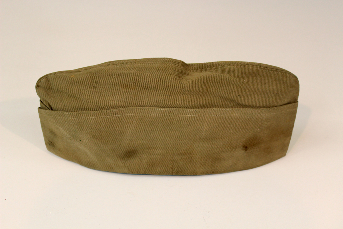 Khaki cotton twill garrison cap, World War II era. Tan leather band inside with punched lettering, "O.W. MARRIN, JR." and "OWM."