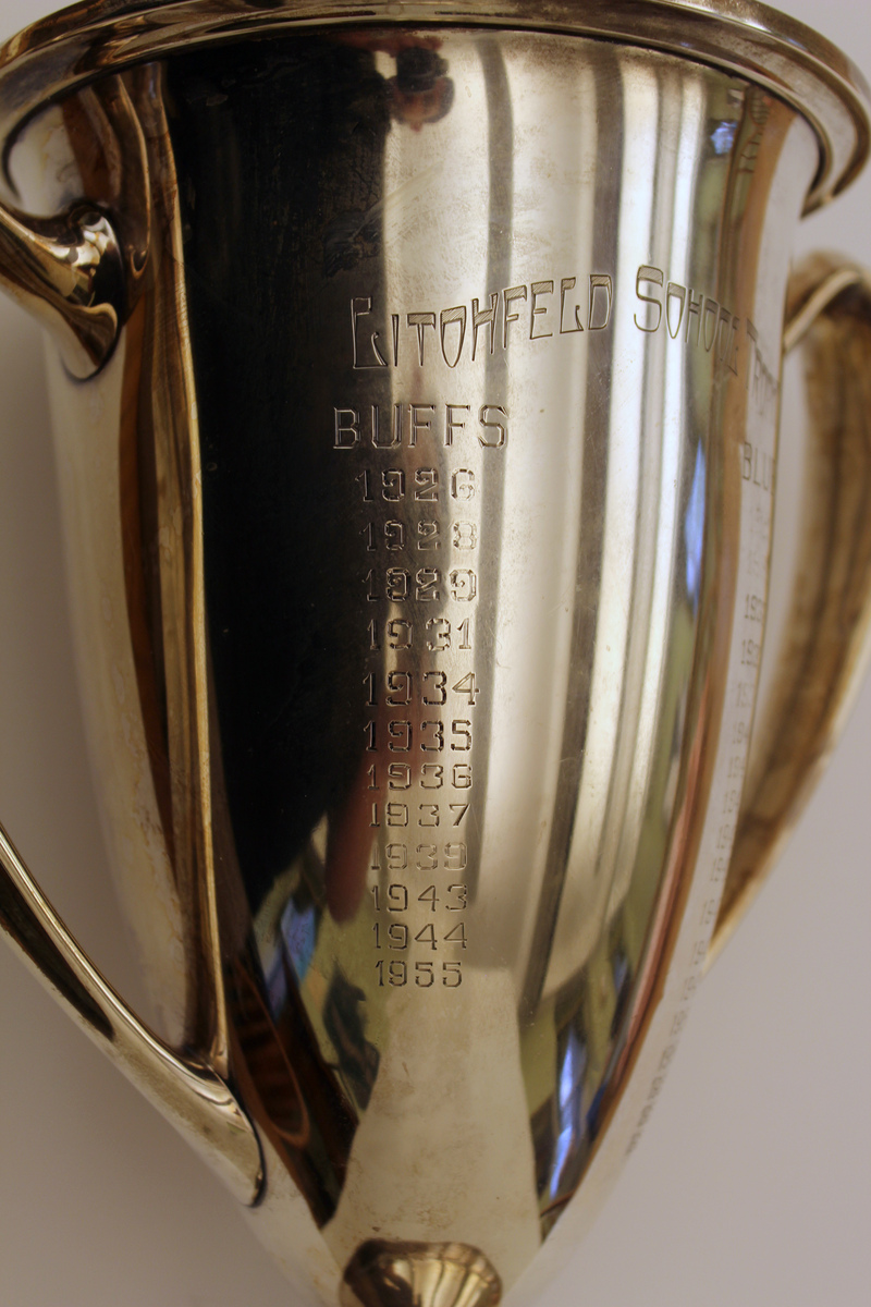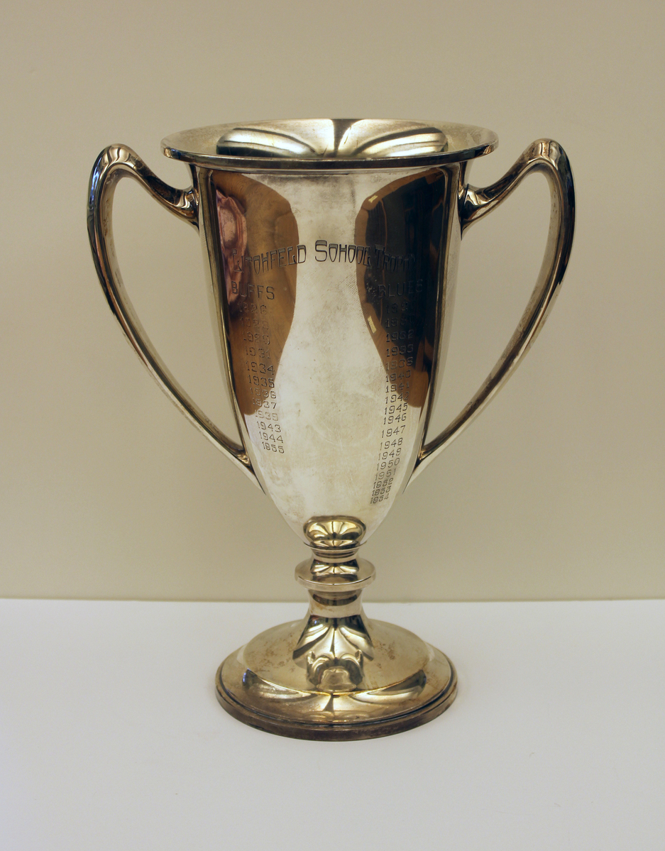 Intramural trophy from the Litchfield School, sometimes referred to as the Sarcka School (after Earle Sarcka, headmaster). Formerly on Goshen Road in Litchfield, the Litchfield School was founded by Charles Brusie in 1904 in Ossining, New York; it was moved to Litchfield in 1922. The boys' school was divided into two organizations, the Buffs and the Blues, for all competitive activities. The trophy was given to donor's father, a former student, by Earle Sarcka.