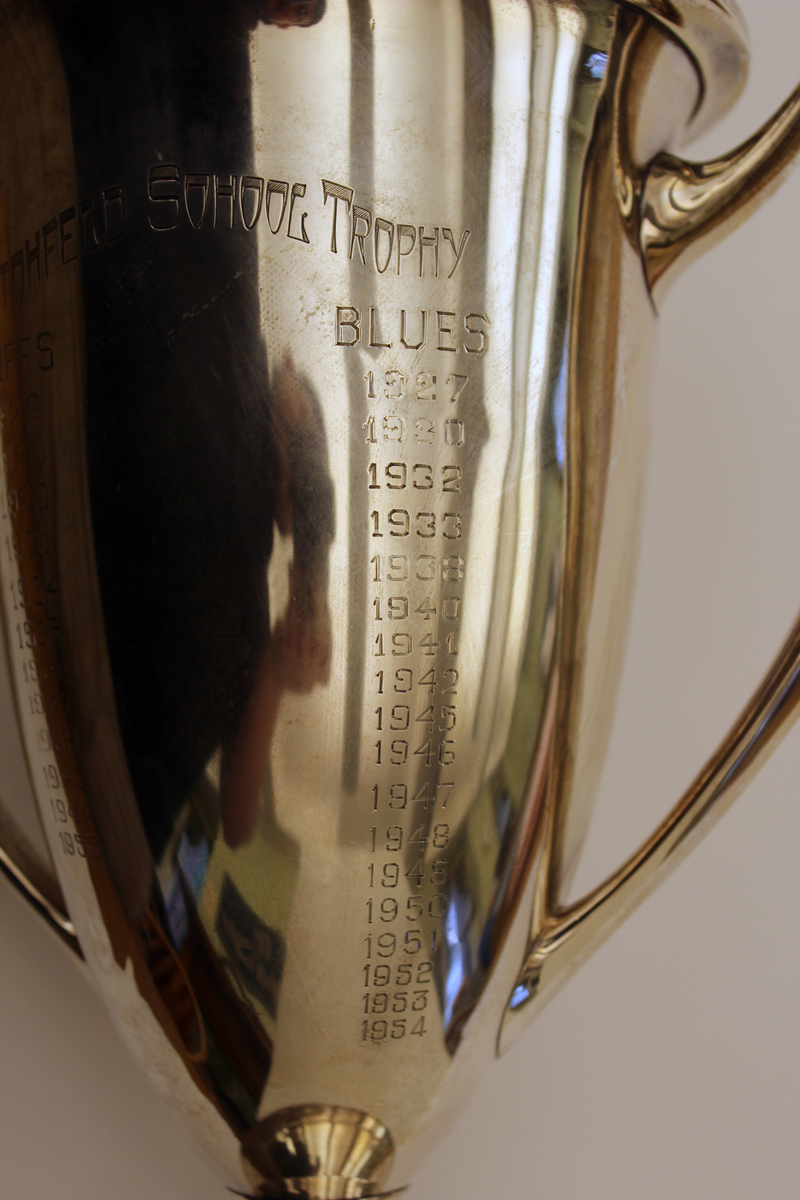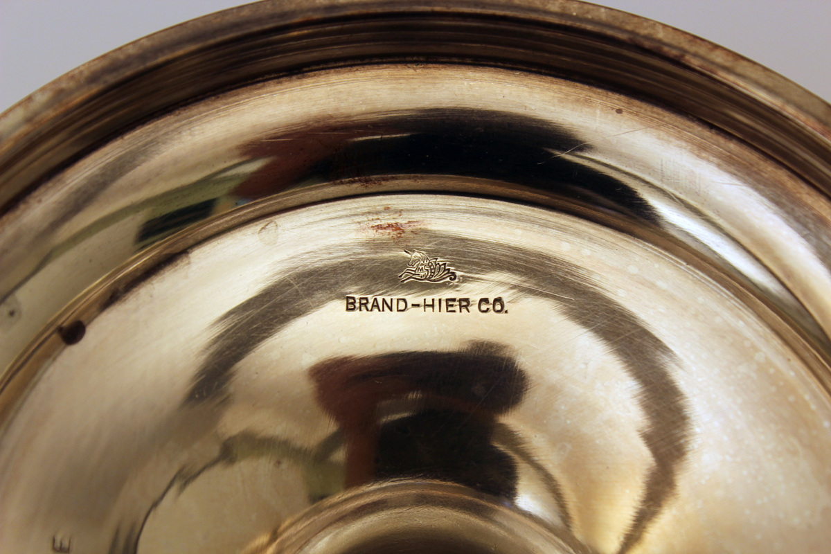 Large trophy or loving cup, sterling silver. Urn shape with defined rim, terminating in round foot. Two ear-shaped handles. Engraved on one side, "LITCHFIELD/SCHOOL/TROPHY." Two columns underneath, labeled "BUFFS" and "BLUES." Award years range from 1926 to 1955. Hallmark underneath foot, "BRAND-HIER CO./1266 C/STERLING/925 1000 FINE."