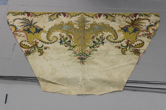 Part of a religious garment or vestment. Background of cream damask. Hemmed on three sides and only partly hemmed on fourth. Covered with very elaborate embroidered design. Large swags and scrolls with detailed background. Vines of flowers in a variety of colors. Seam line down center. Unlined.