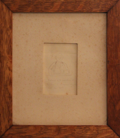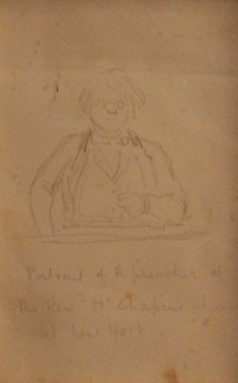 Pencil sketch of a man from the waist up. The man is wearing a coat, vest and necktie, and wearing spectacles. Written in pencil below the sketch is "Portrait of a preacher at the Rev. Mr. Chapin's church in New York." "This sketch was drawn by Thackeray in the notebook of A. Ernest Vanderpoel when the latter was a boy and both were going to Europe in a steamer in 1857" written in pencil on the back.