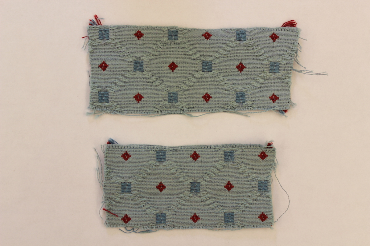 a-c: Rectangular fabric swatches made of cotton. Background is blue with lighter blue large diamonds woven on top. In the center of each diamond is a small red diamond and at each corner of the blue diamonds is a darker blue rectangle. Fabric has a fairly open weave and is rough and heavy to the touch.