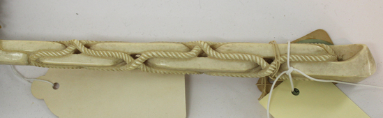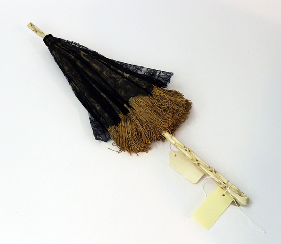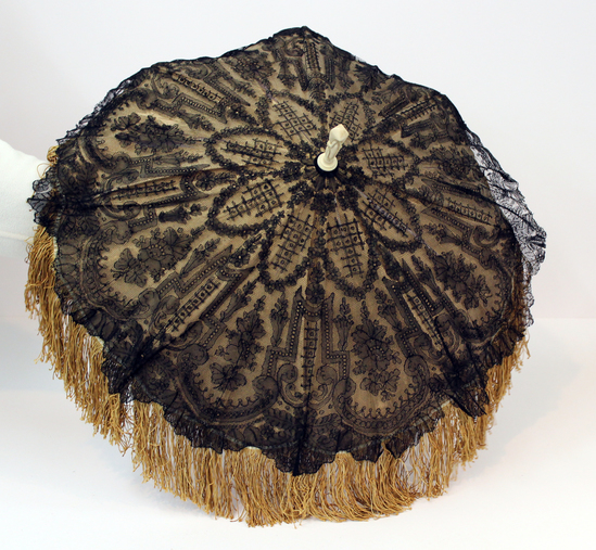Parasol; gray silk lining; beige taffeta with long gold fringe and black lace overlay; carved ivory handle and ferrule that resembles interlocking chain with a rope intertwined throughout