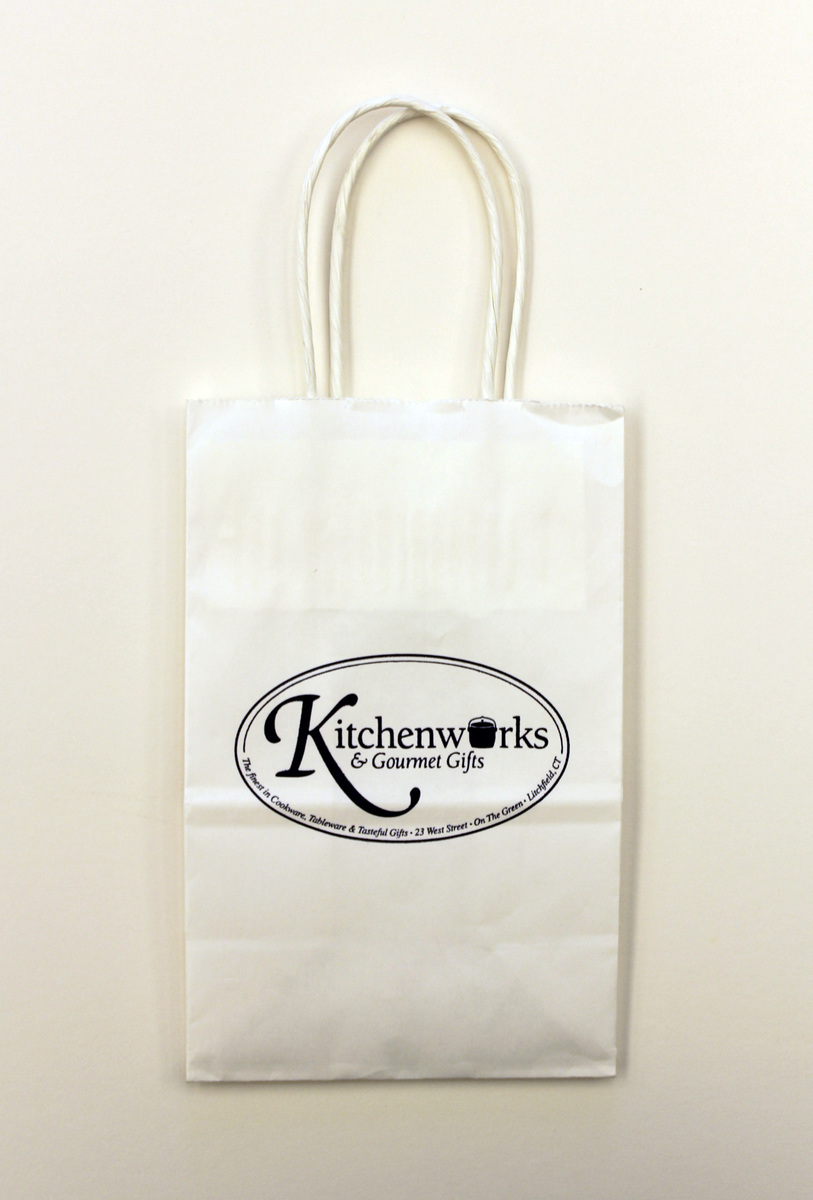 Rectangular, white paper shopping bag with thin, white paper handles. Printed in blue ink on one side, "Kitchenworks/& Gourmet Gifts/The finest in Cookware, Tableware & Tasteful Gifts - 23 West Street - On the Green - Litchfield, CT," in designed store logo.