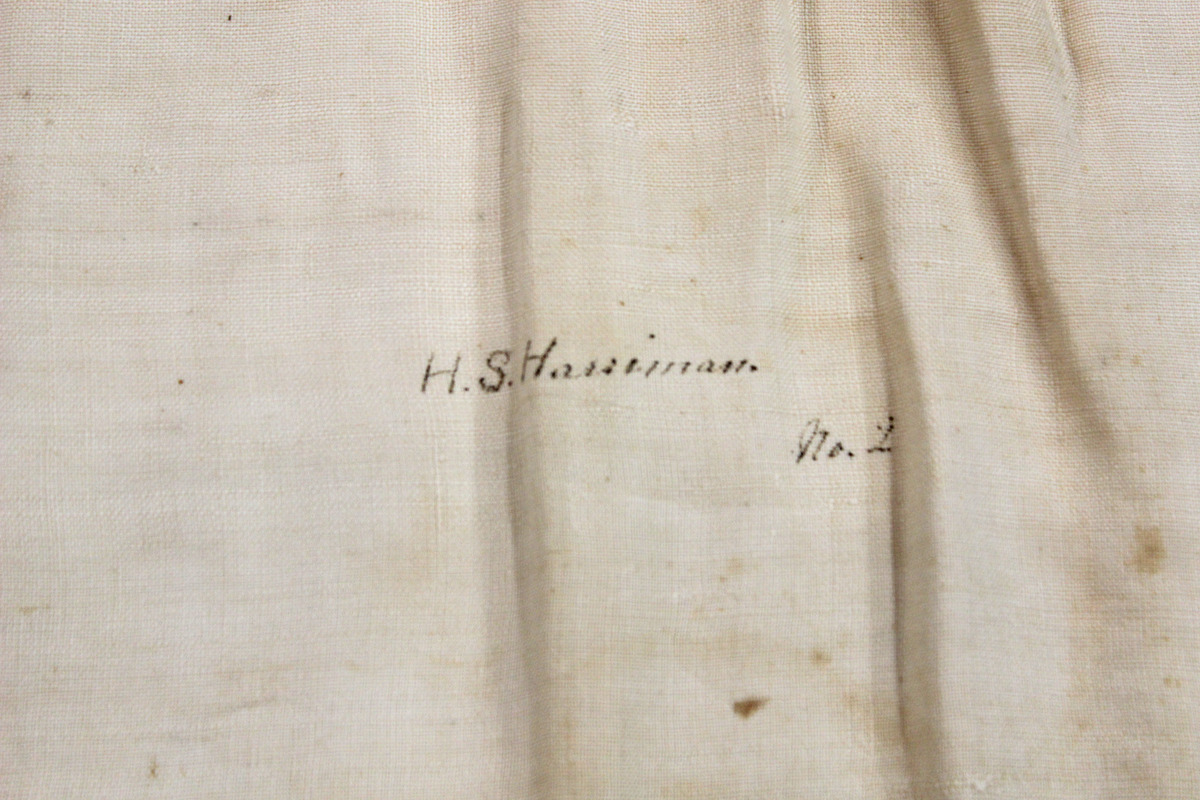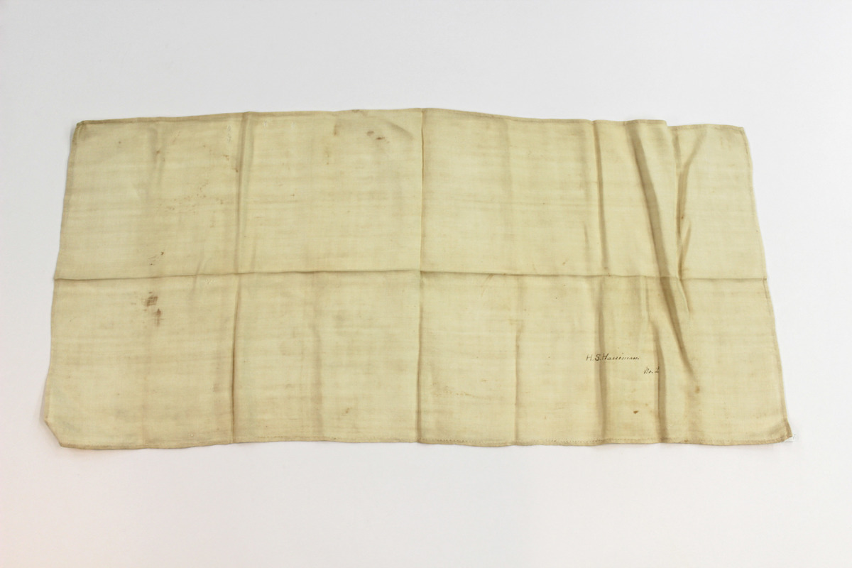 Rectangular linen napkin, written in ink in bottom quarter "H.S. Hossiman No.2."